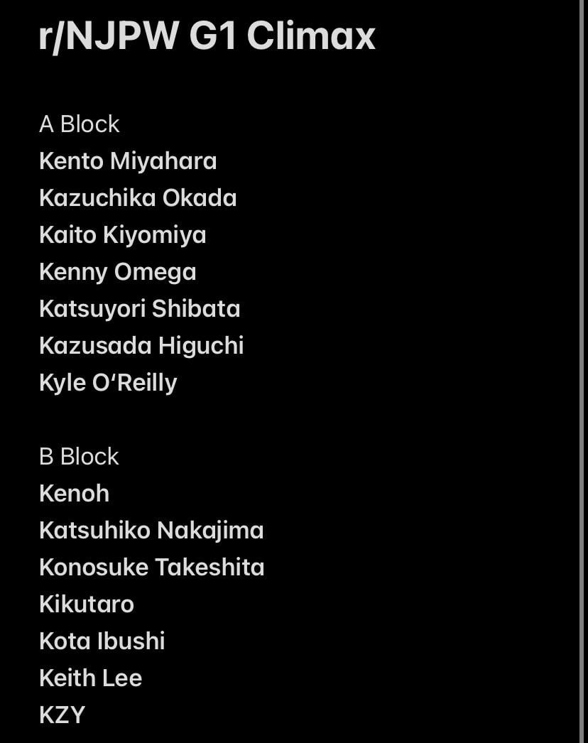 NNew Japan Pro Wrestling The r/NJPW G1 Climax Day 15 July 12, 2024 The r/NJPW G1 Climax Day 15 by SevenSulivin Tags:New Japan Pro WrestlingNJPW Leave a ReplyYou must be logged in to post a comment.