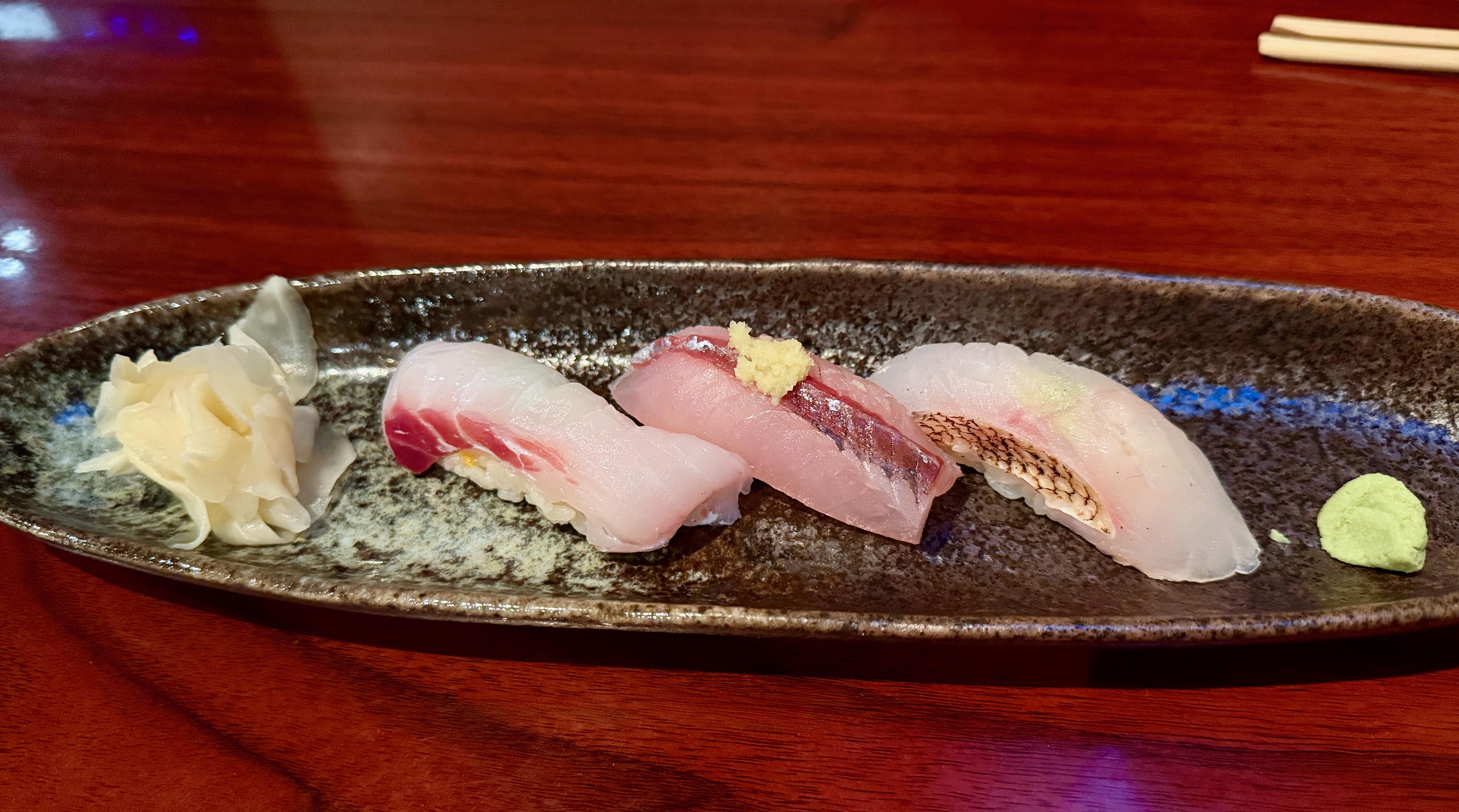 SSushi Sekisui East- best sushi in Memphis! September 27, 2025 In order (L-R): Emperor fish (Fuefukidai), Flying fish (Tobiuo (飛魚), tilefish, (amadai). by NigelStephens Tags:Sushi