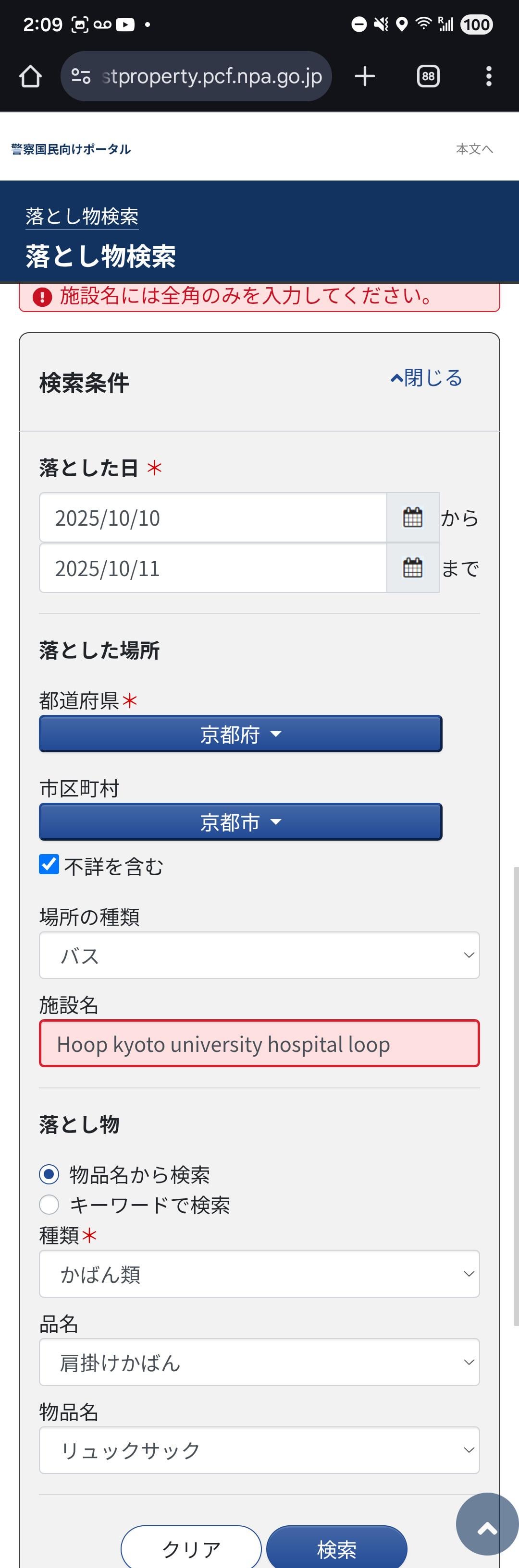It's 2am and I just realized I left my backpack on the Kyoto University hospital loop bus between Kyoto station and Kyoto-kawaramachi. Tried reporting online and got this error message. I'm here til Tues morning, then headed back to Tokyo til Friday. Any suggestions? I don't know Japanese, so Google translate has been my best friend. Thanks in advance