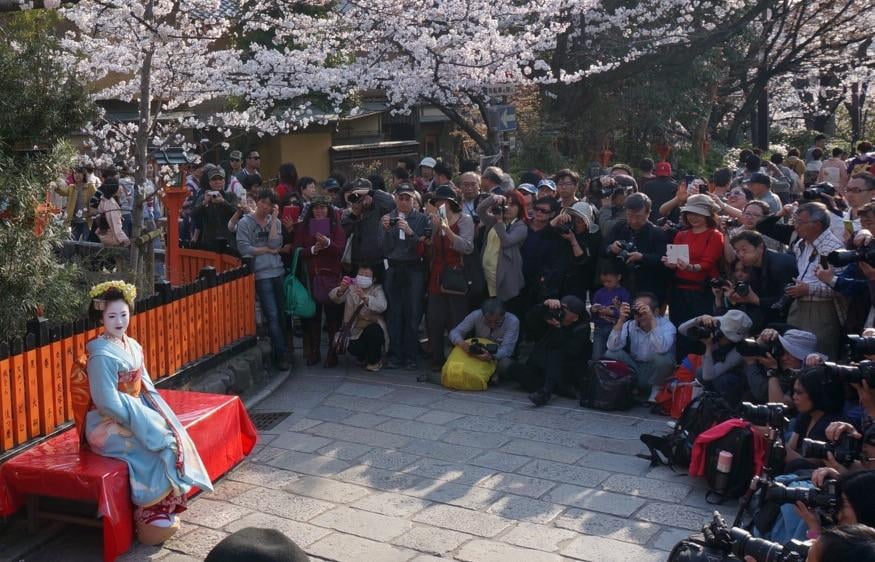 Visiting Japan from Canada, walking through Kyoto when I spotted a large gathering. There had to have been hundreds of people taking pictures from a respectable distance.
