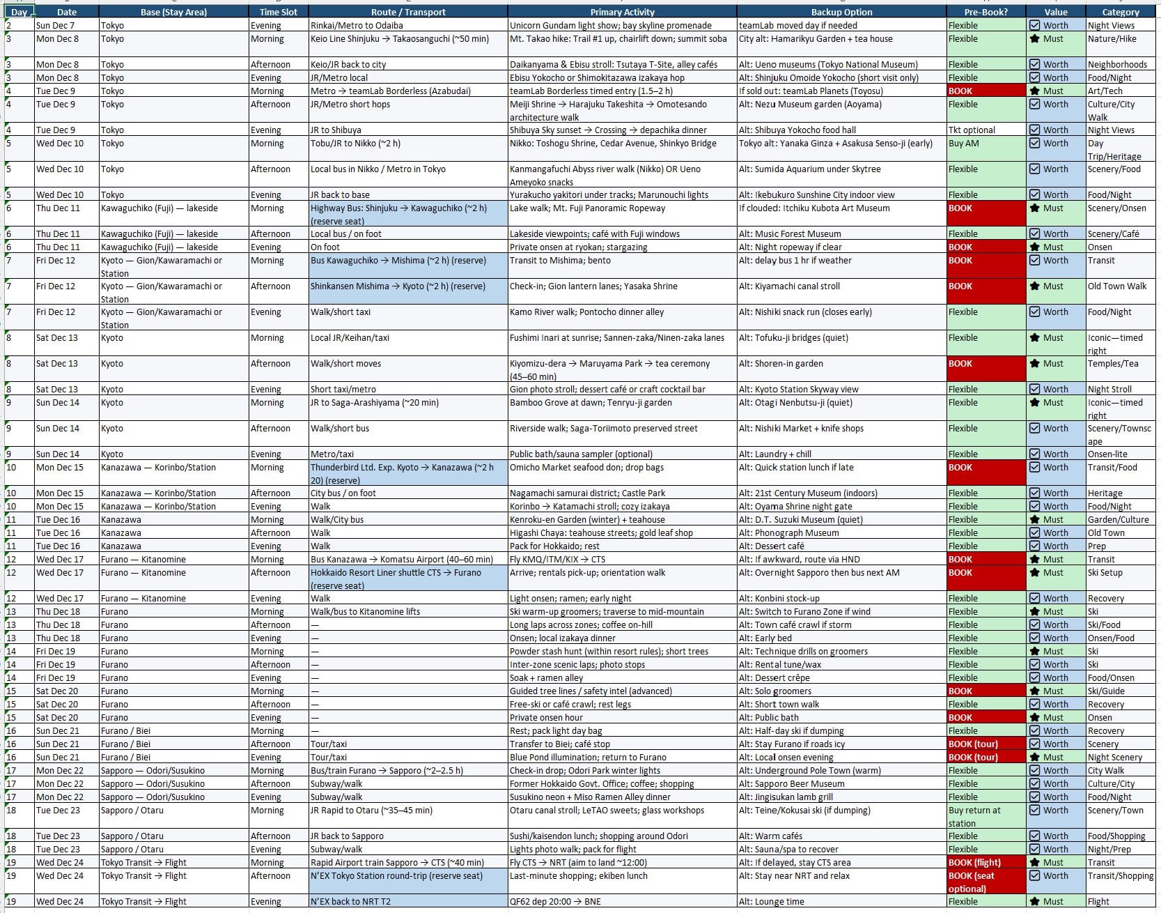 Route → Walk. Primary → Pack for Hokkaido; rest. Backup → Dessert cafés. Pre-book → Flexible. Value → Worth. Category → Prep.