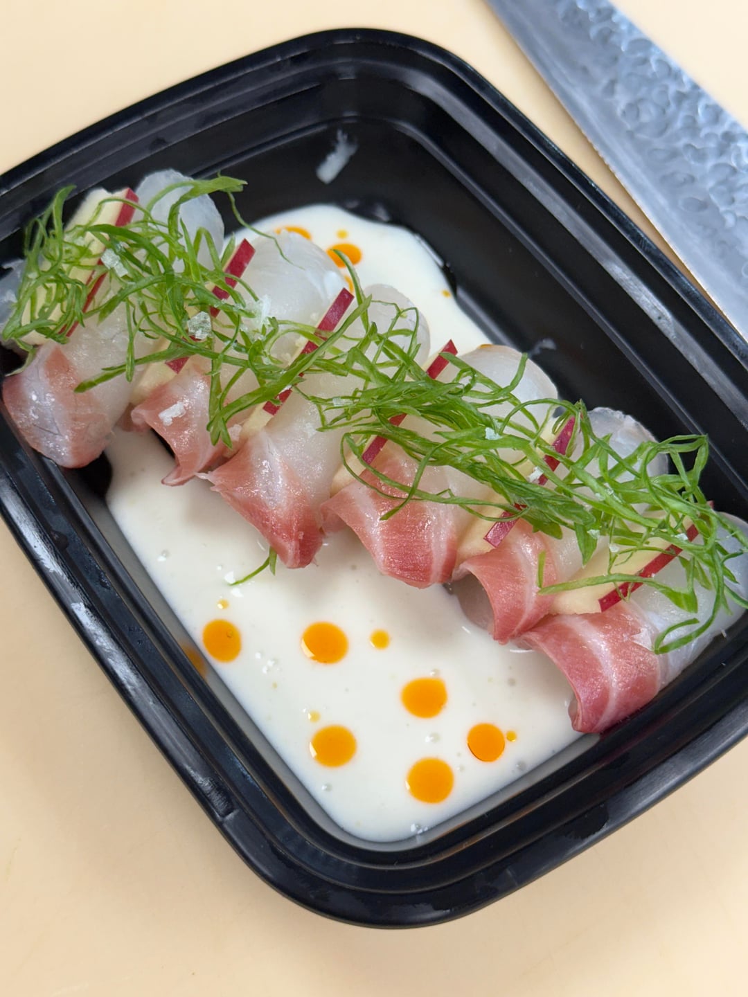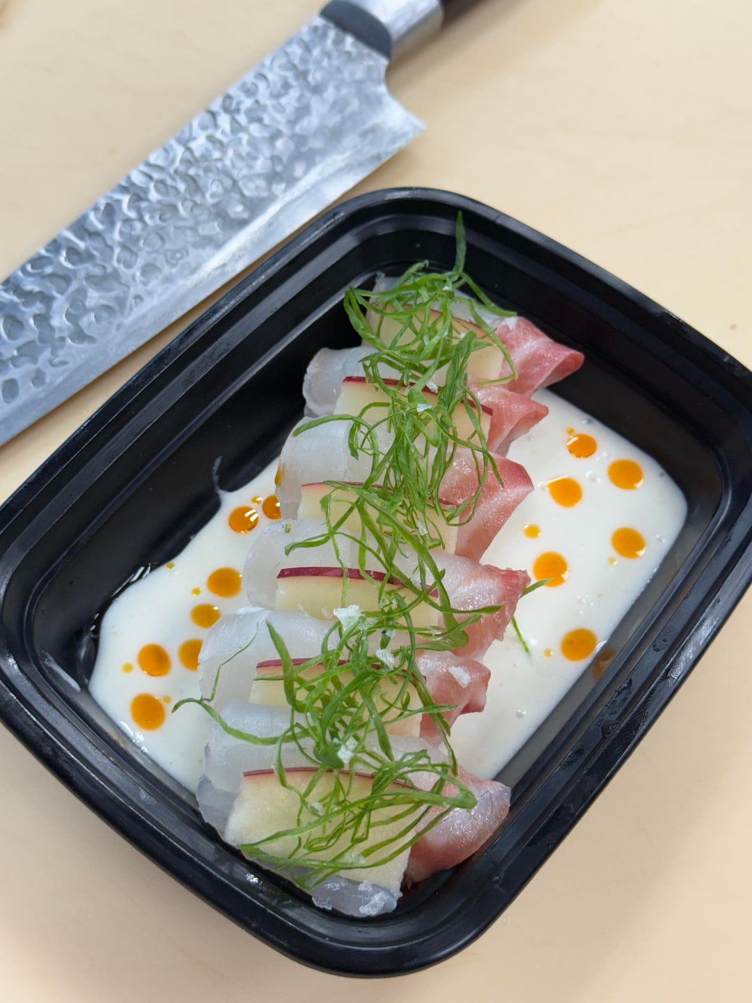 Each of my sushi chefs is tasked with coming up with new dishes for my kitchen, and Chef Jose Victor hit a home run with this coconut milk-based Madai sashimi with hot chili oil and negi curls.