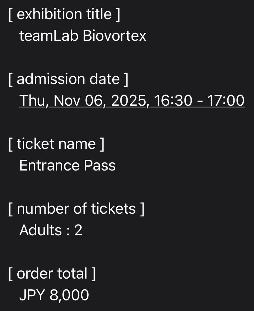 Looking to sell two teamLab Biovortex tickets since I won’t make it. DM if interested