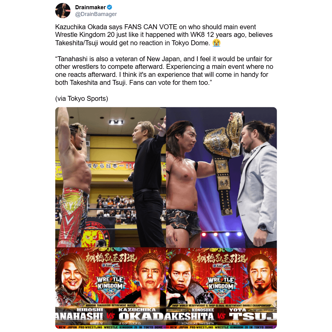 NNew Japan Pro Wrestling Okada Believes His Match With Tanahashi Should Main Event Wrestle Kingdom 20 November 10, 2025 Okada Believes His Match With Tanahashi Should Main Event Wrestle Kingdom 20 by Not_Kenta_Kobashi Tags:New Japan Pro WrestlingNJPW