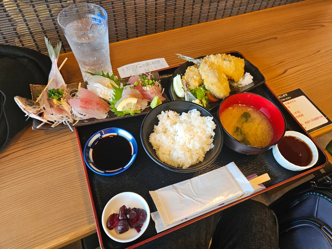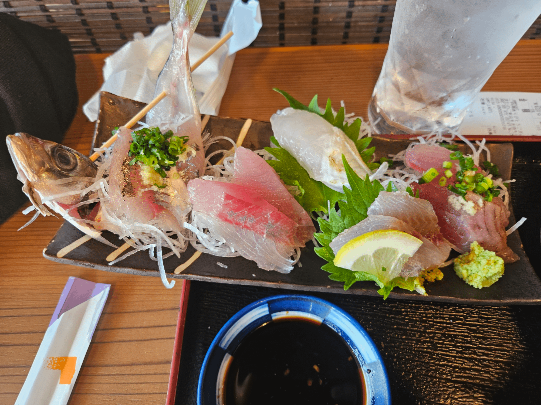It is set of fried horse mackerel with assorted sashimi. Staff only speaks Japanese. I know that it is horse mackerel and bonito but no idea what are the other 2 or three. I've heard something like "milu" but I am in Odawara so I don't think that it would be omilu (bluefish trevally). Any idea what some of the sashimi could be?