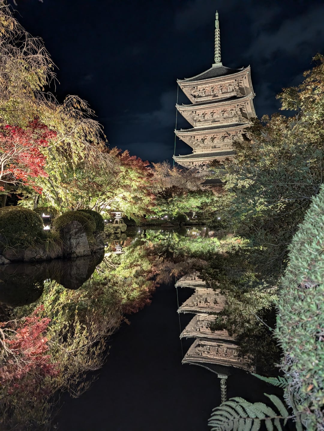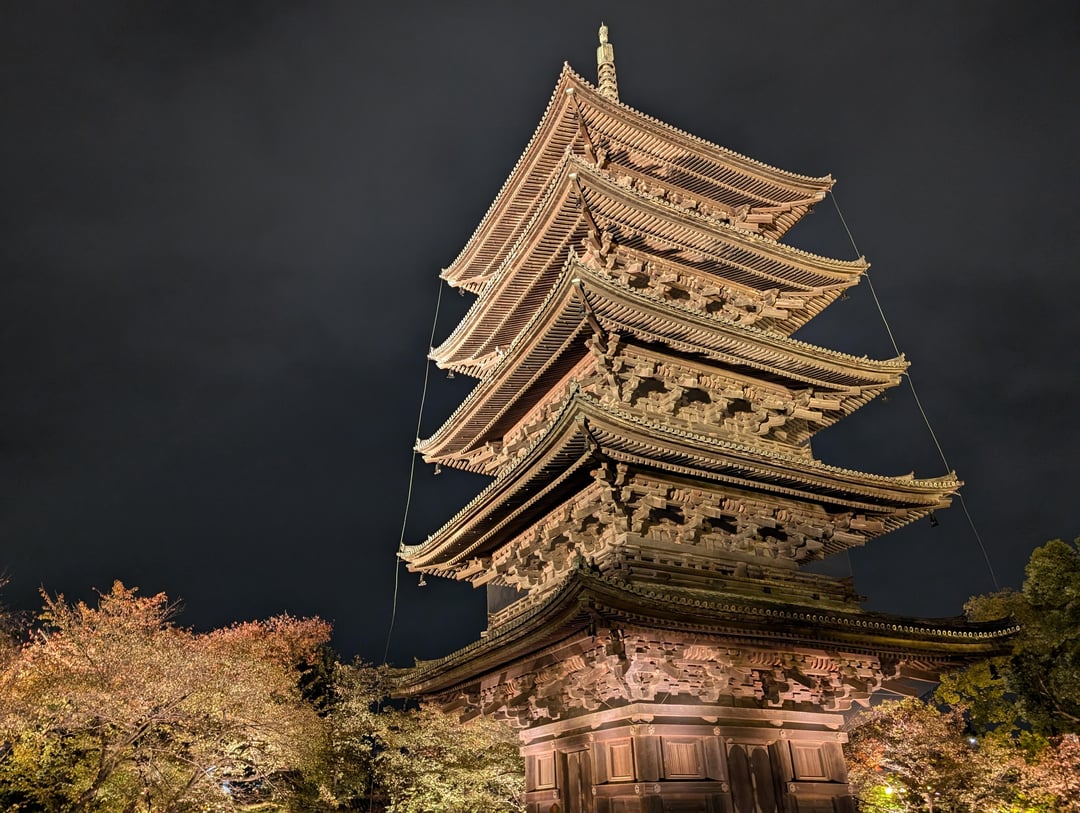 If you are in Japan in autumn or spring, I recommend looking into special nighttime illumination events that temples and shrines may put on. They use strategically placed lights to illuminate the entire complex in a way that is very beautiful. I made the spontaneous decision to go to Kiyomizu-Dera one night, and Toji Temple the next night and wanted to share the pictures I took. 🙂