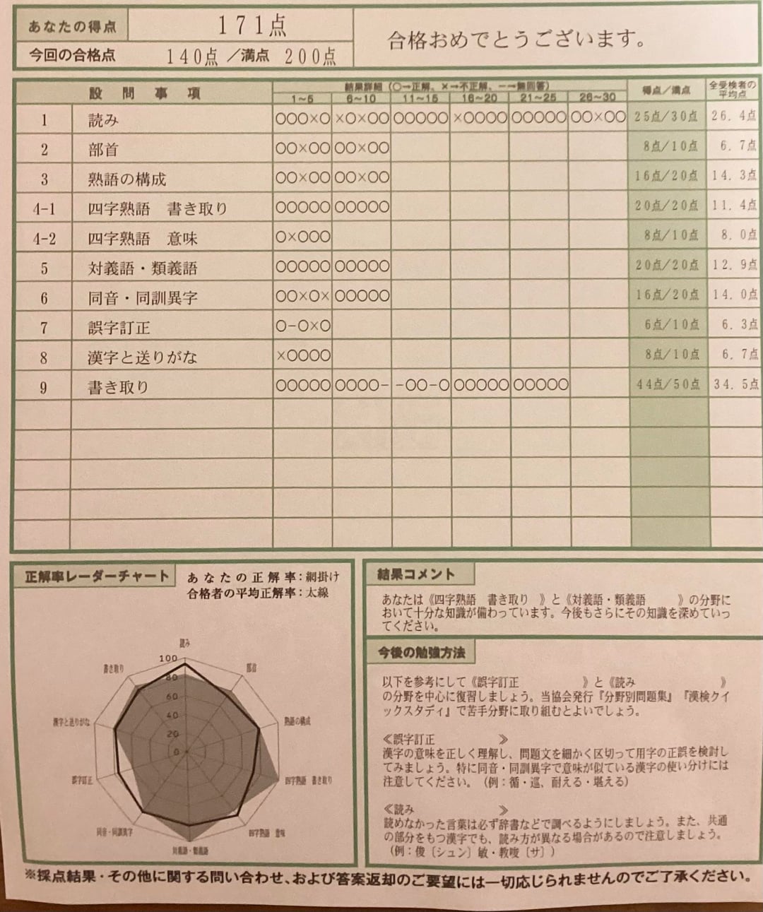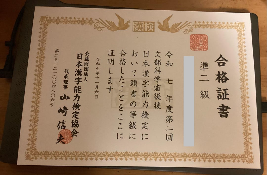 My certificate of passing kanken pre 2 came today. I got a score of 171/200 as I calculated. Wow, this feels really good to look at. I need to hang this up!