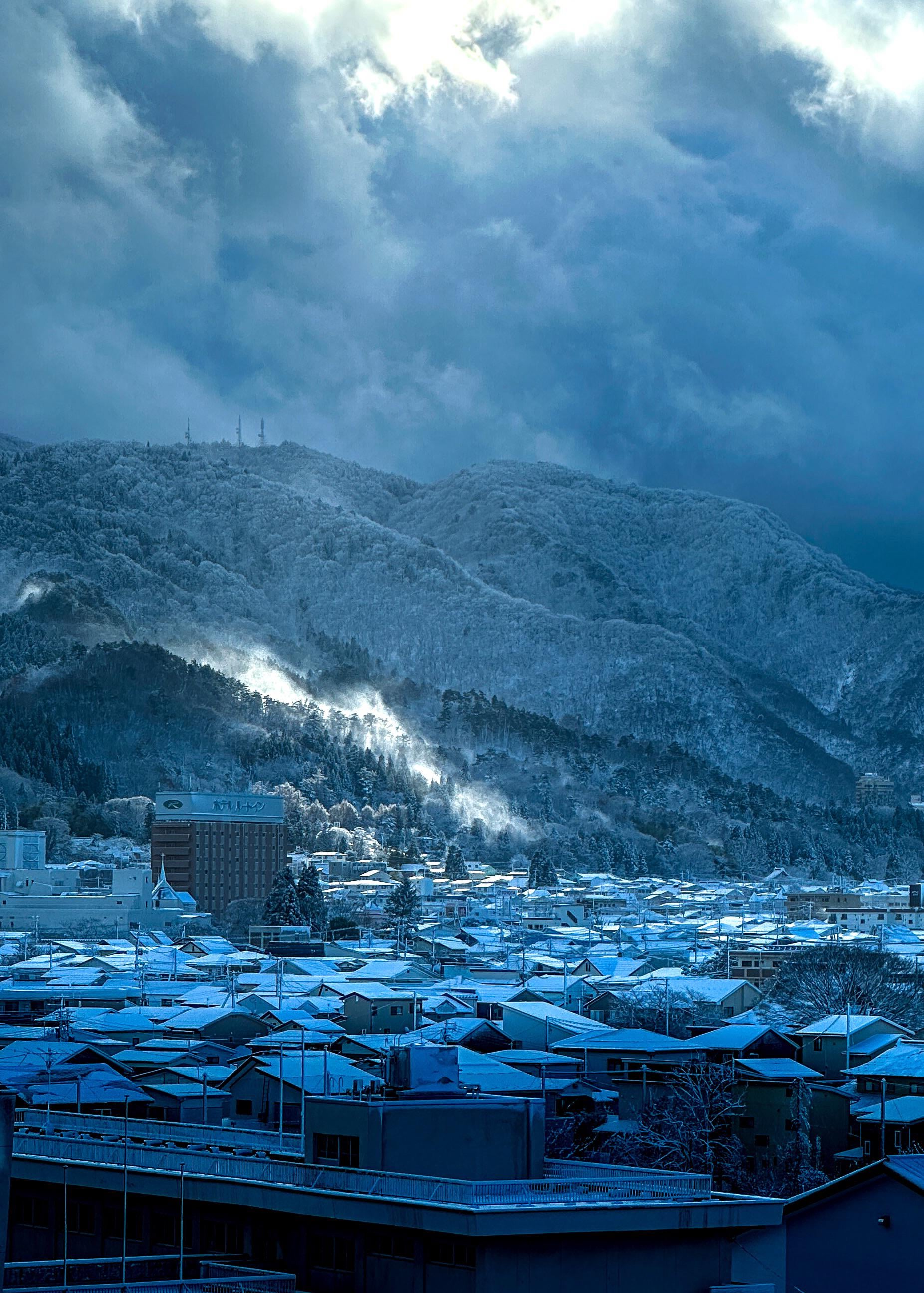 Aizu-Wakamatsu, Fukushima: the morning comes, and I open my hotel curtains to a muted glow. On the street below, fresh tyre marks weave through a thin layer of snow. Houses sit under clean white roofs that make the town feel still. In the distance, the hills rise behind everything, softened by mist, their forests catching a faint blue light.