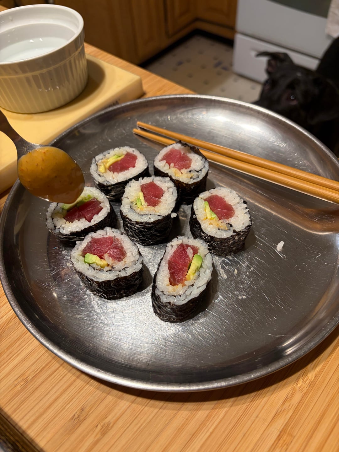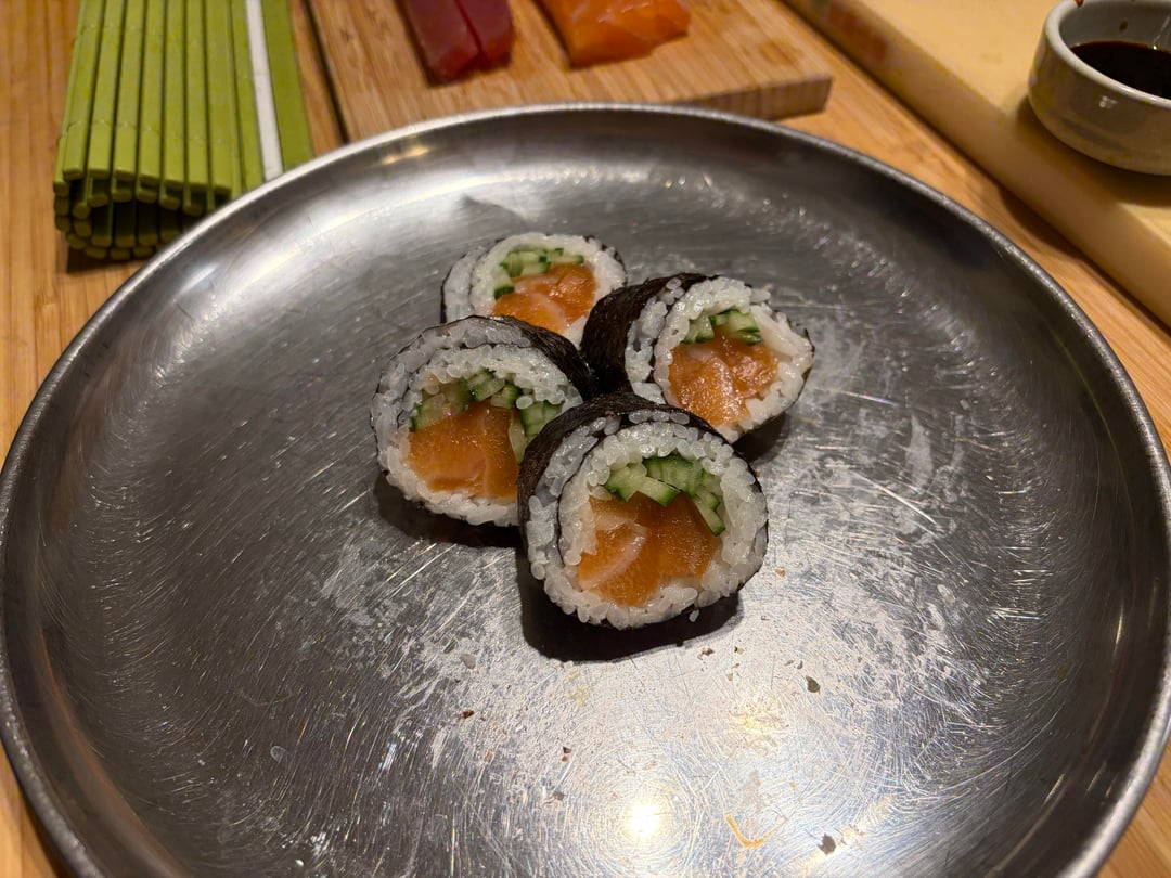I bought a pre sectioned piece of tuna and salmon at H Mart. 5 rolls later and half the fish later my wife and I are so full. Ended up making 8 total rolls