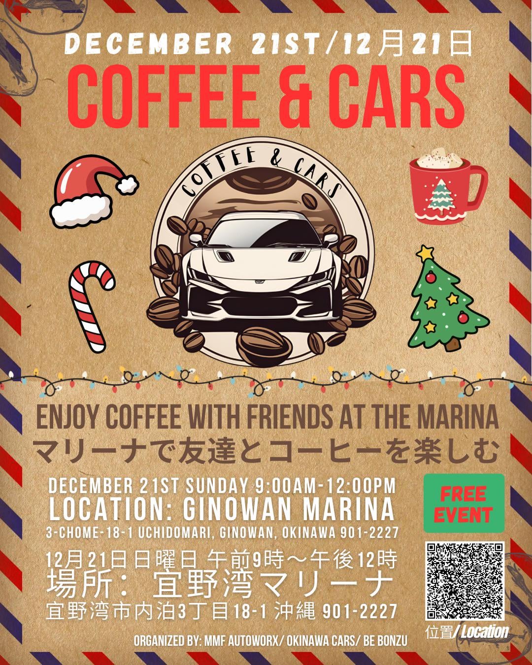 Happy holidays everyone. Our next Coffee and Cars is next week on Sunday. It’s a bit last minute but if you’re free, come out to the Ginowan Marina to hangout. Free event! ¥300 parking. Hosted by @okinawacars @mmf_autoworx and Be BONZU. 皆さん、楽しいホリデーシーズンをお過ごしください!次回の「Coffee and Cars」は来週日曜日です。少しギリギリですが、もしお時間があれば宜野湾マリーナにぜひお越しください。イベントは無料!駐車場は300円です。