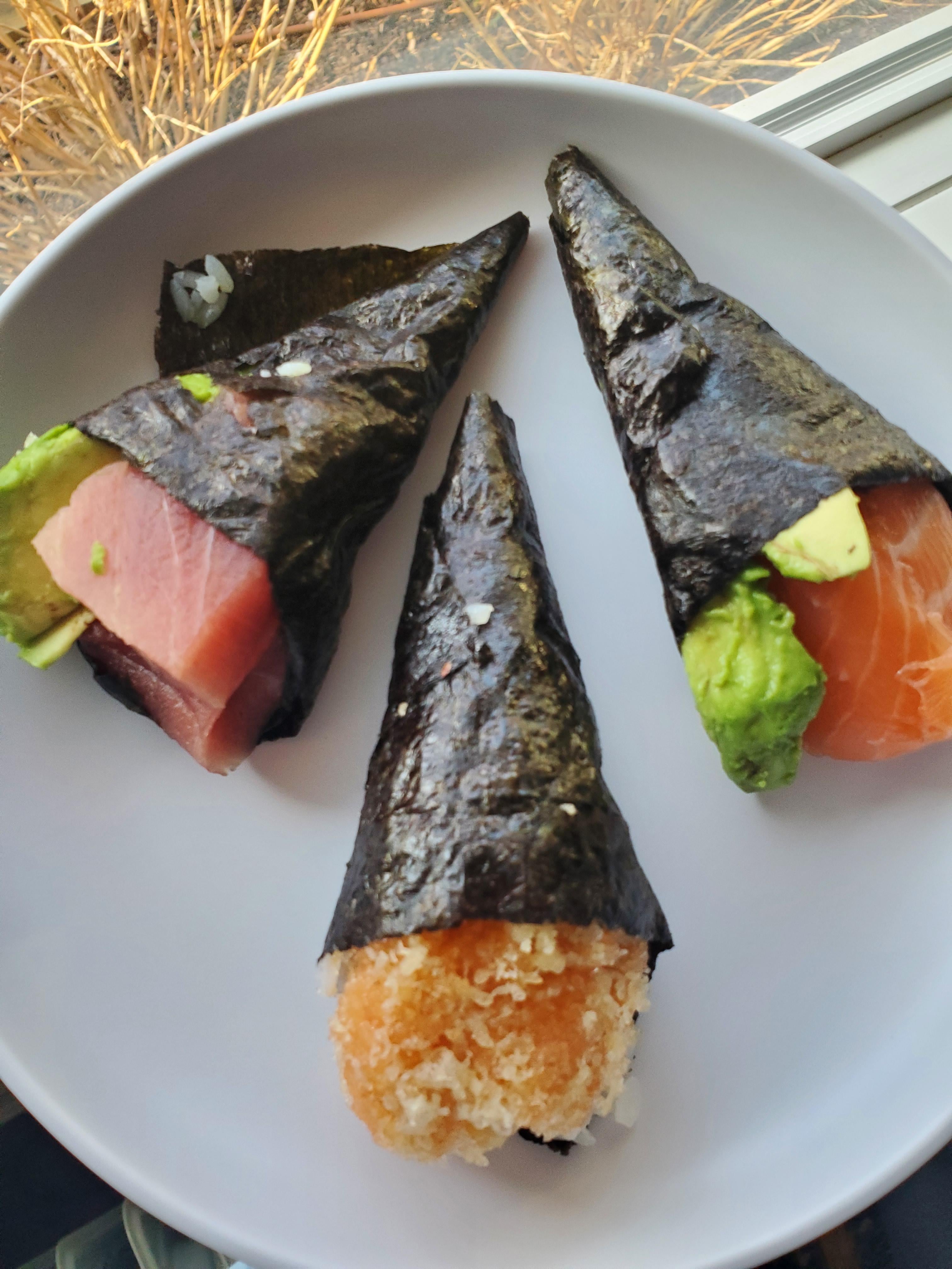 I see Tuna/Salmon and some Avocado slices , hand rolled in dried seaweed. I am not sure about what’s in the third roll, but they look Amazing.