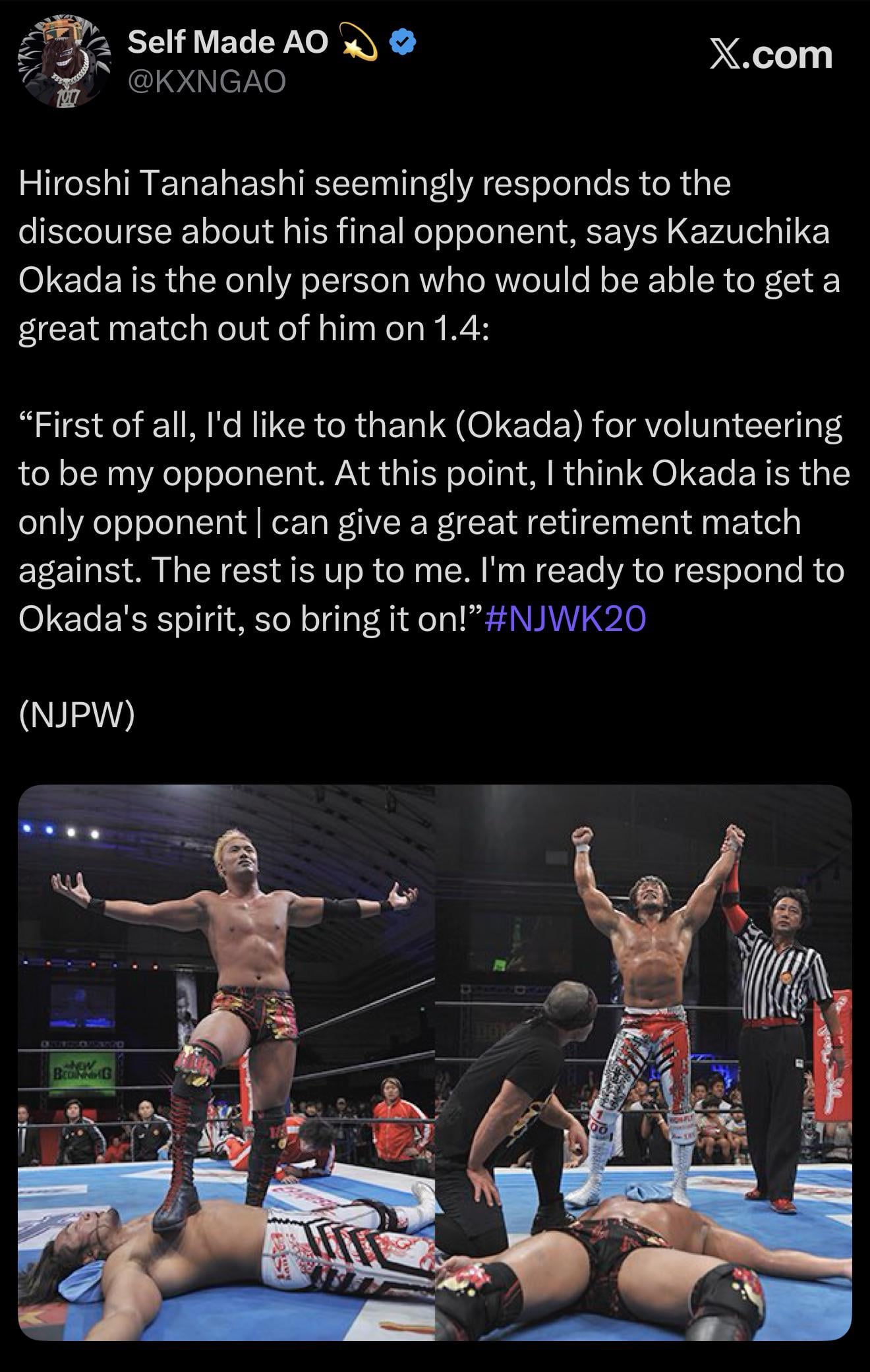I mean, it’s not like he’ll say, “Okada was my second choice. I really wanted to go out against my old comrade Shinsuke, but WWE said no, so….”