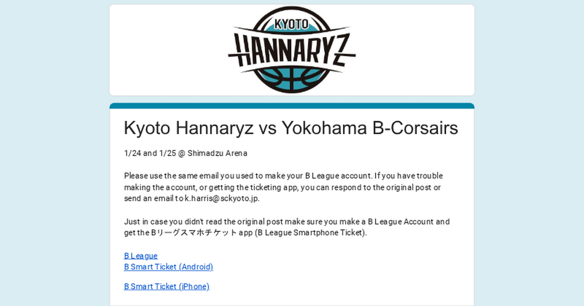 To get tickets: please fill out the Google Form and create a B League account using whatever email address you used to fill out the Google Form. You will also need to get the B League Smart Ticket app (you should be able to find it on whatever app store you use), so that we can send the tickets directly to you. The account may be a little annoying to create but both it and the app are free, and you can then scan your tickets on the app to enter the arena, and mainly, it will save us a bunch of time distributing tickets. If you absolutely refuse to make an account or get the app to get tickets, I will considering sending the tickets anyway if you send one well written paragraph explaining why (also if you have trouble getting the app for any reason let me know).