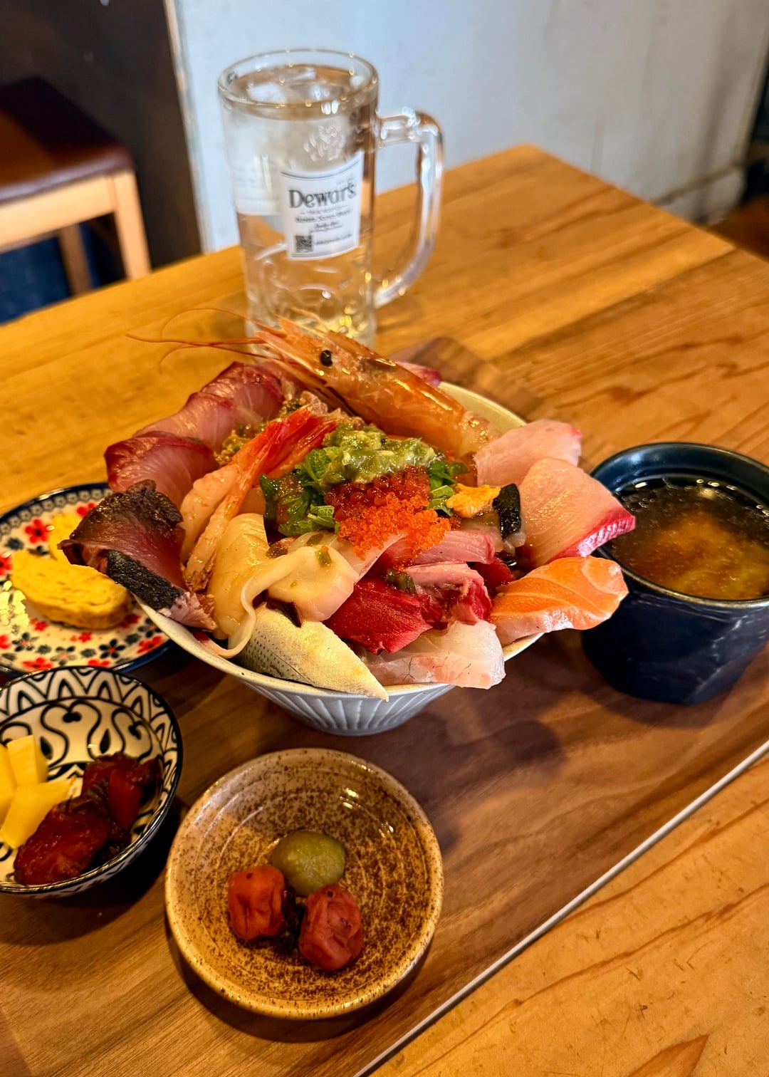 The bowl itself is fully topped with various slices of fresh sashimi and also various kinds of seafood, such as shrimp, squid, scallop, uni. The meal set comes with a side of some pickled veggies, tamagoyaki, macaroni, green beans and a small cup of daikon miso soup! The total bill came up to just about ¥1980, which I would say is absolutely worth it for what you’re getting 😋