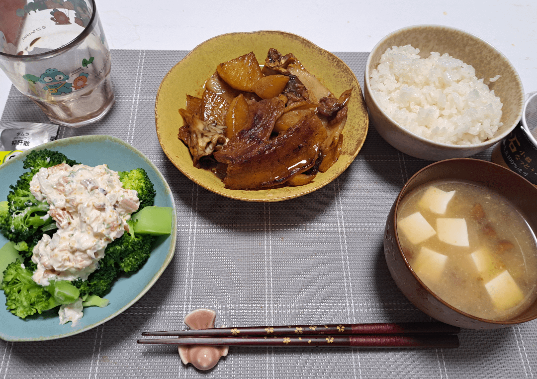 From left to right: nameko mushroom soup, white rice, simmered pork belly with daikon radish, a salad of broccoli with mayonnaise and hokke-gai (surf clam), Chinese herbal medicine, and black natto.