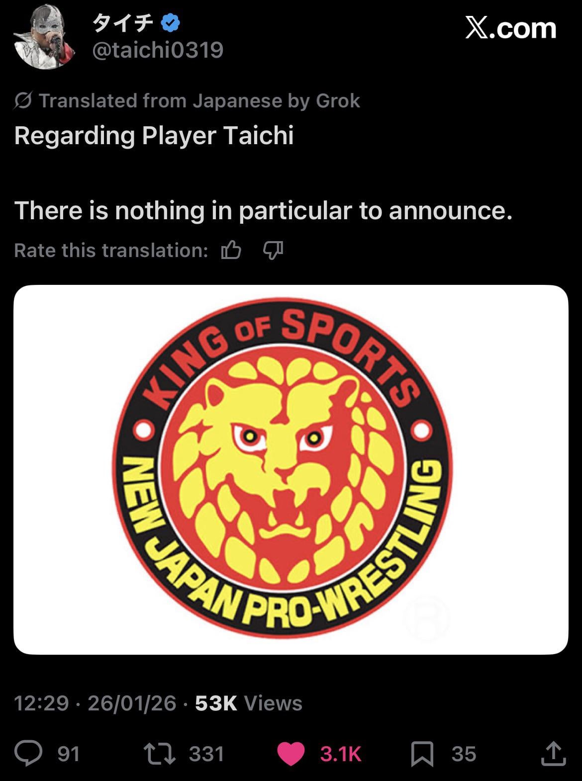 NNew Japan Pro Wrestling An announcement from Taichi January 26, 2026 An announcement from Taichi by itsjobberingtime Tags:New Japan Pro WrestlingNJPW