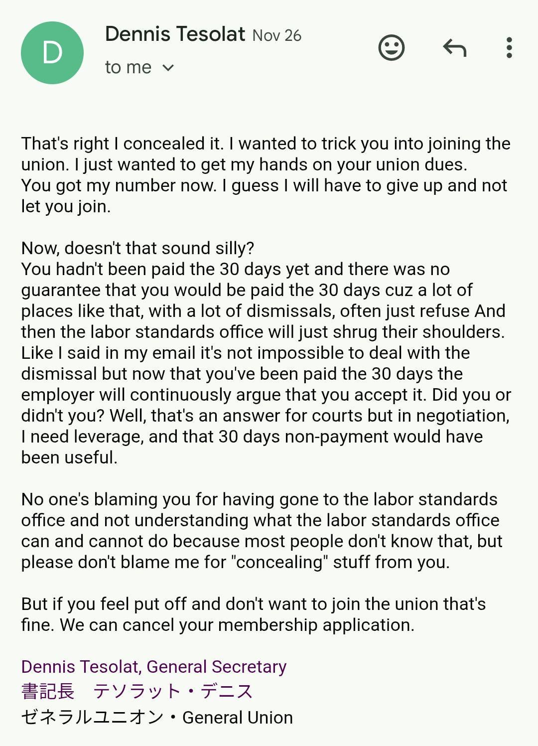 Back in August, I was fired from an independent English immersion after school program unfairly, and with no warning. At the time I did not know it was illegal. I went to the labor office after it was clear I would not be getting the 30 days pay my contract said I would get. I told them I felt it was an unfair dismissal, and they said I had to pursue the 30 days pay first. I then contacted the General Union, and had a consultation. I told them all of this, and they made no indication that this action would preclude me from getting help from the union, so I joined. The day after I joined, I told them I had gotten my 30 days pay from the labor office, and had this email exchange. I did not respond to this, and made multiple attempts to contact anyone else at all at the union, which were ignored. I finally got a response when I responded to a newsletter, asking to not be sent newsletters anymore. That got a response telling me they would vote on whether to accept my resignation at the next meeting. I wanted to share my experiences for anyone considering joining the General Union in Osaka. This is the level of professionalism you can expect.