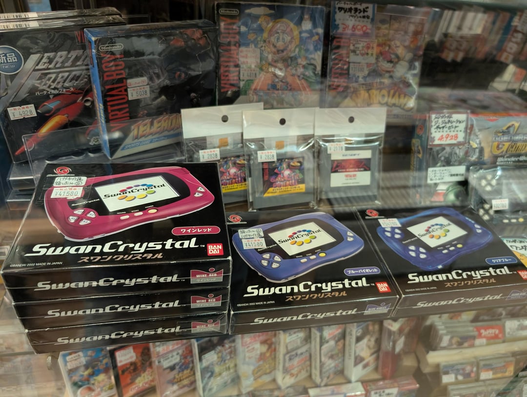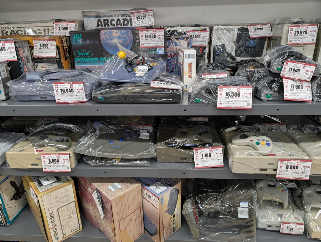 I also like to find unusual hardware that never made it outside of Japan. There's things a lot of folks know about like the WonderSwan and the Famicom Disk System, but sometimes I stumble on systems I'd never even heard of. Take a look behind the Saturn collection – what even is an Arcadia? (This, apparently!).