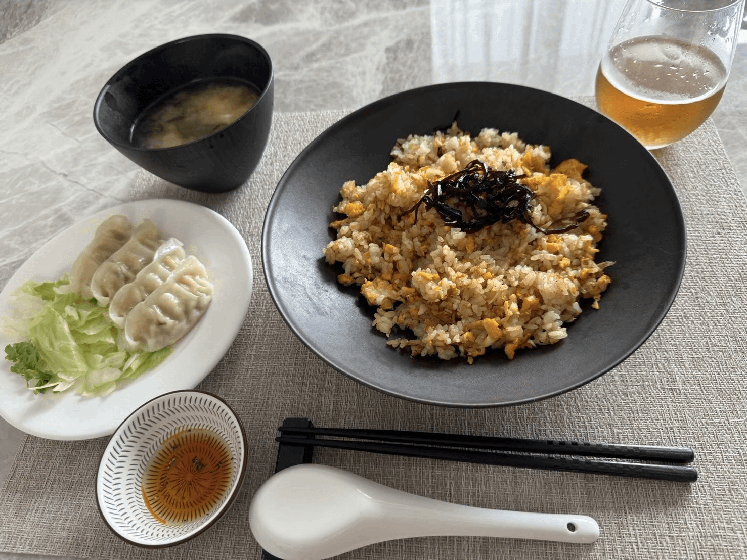 Fried rice, gyoza, and miso soup.