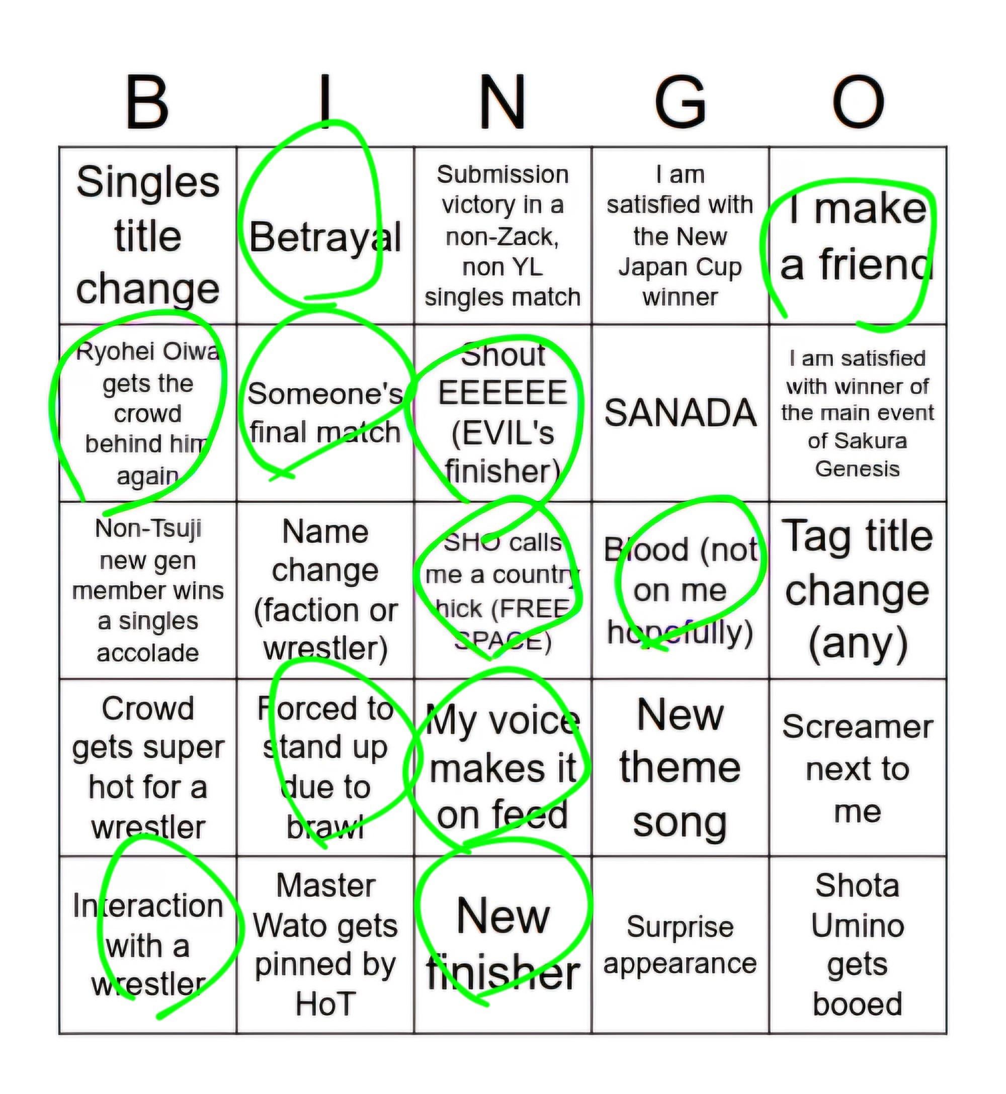 I'll get a bingo if either a non-Zack submission victory happens, or SANADA somehow appears. Former is probably more likely to happen, but it still needs to happen on a show I attend.