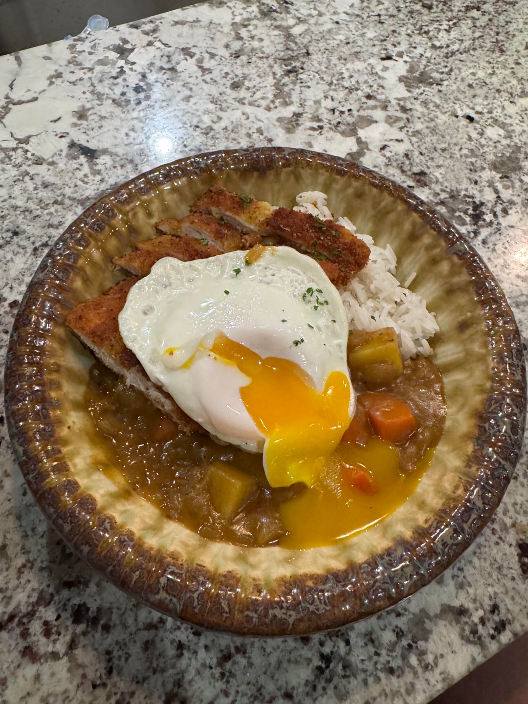 First time making it at home. Thoroughly pleased other than would have liked some texture on my egg; I had a poodle getting my attention so that’s what we have.