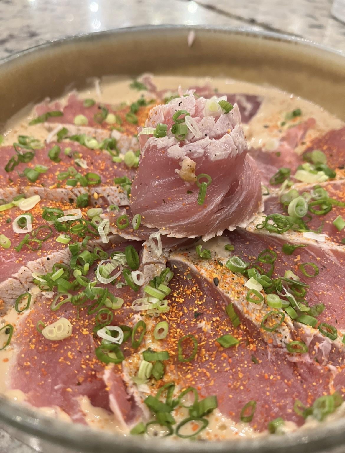 Tuna tataki with ceviche mayo sauce and shishimi