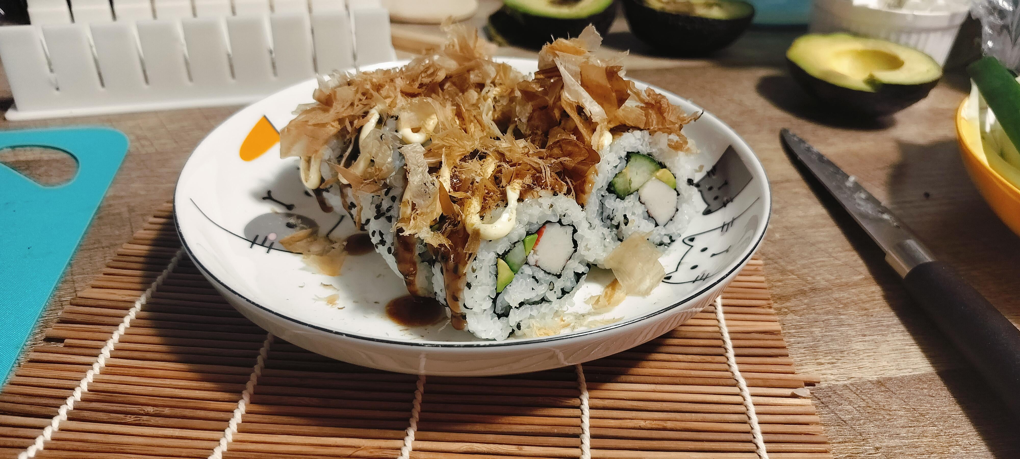 I watched this 30 second tutorial on Shorts to make California rolls. I think they came out bigger than I was expecting but nonetheless tasty. Added some mayo, takoyaki sauce and bonito flakes from my previous takoyaki making.
