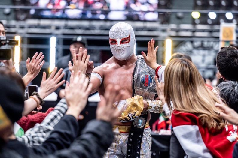 Cool picture of Mistico with a white mask with red eyes to represent the Japanese flag at the first show of Fantastica Mania