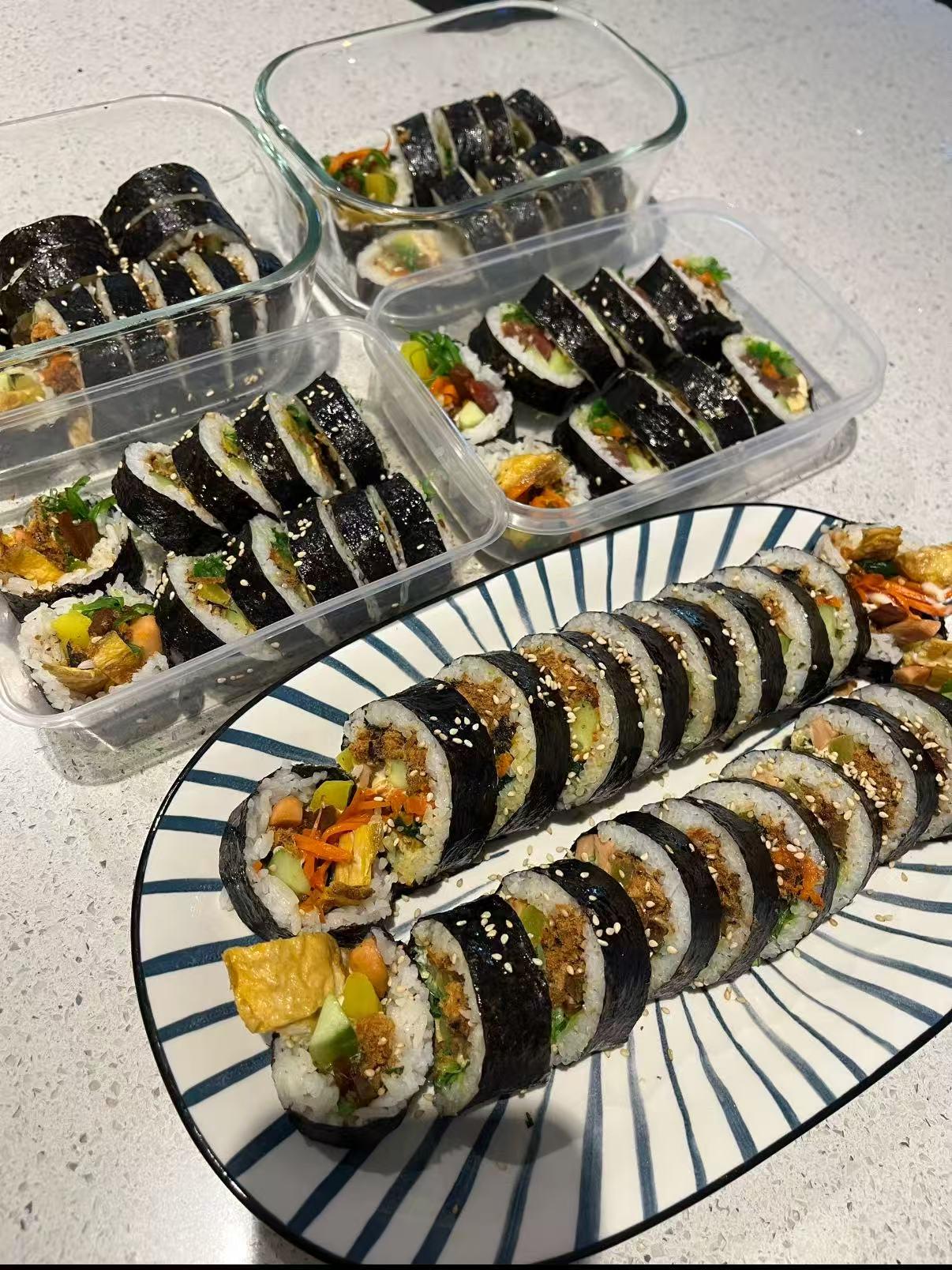 SSushi Spent the afternoon making this March 5, 2026 Cooked white rice (slightly cooled) Roasted seaweed sheets Cucumber strips Pickled radish strips Omelet strips (thin egg sheet cut into strips) Chinese sausage or crab sticks Sesame seeds by GloomyLimit379 Tags:Sushi
