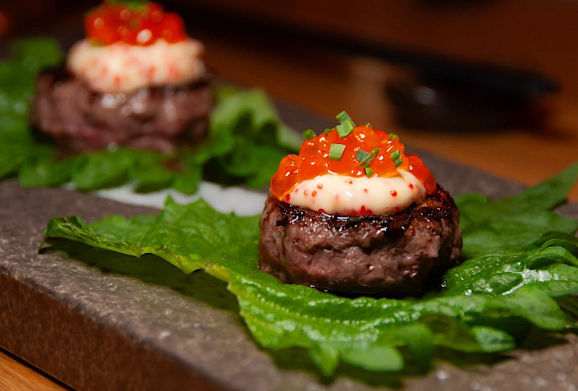 “Steak bite with ikura and spicy mayo”