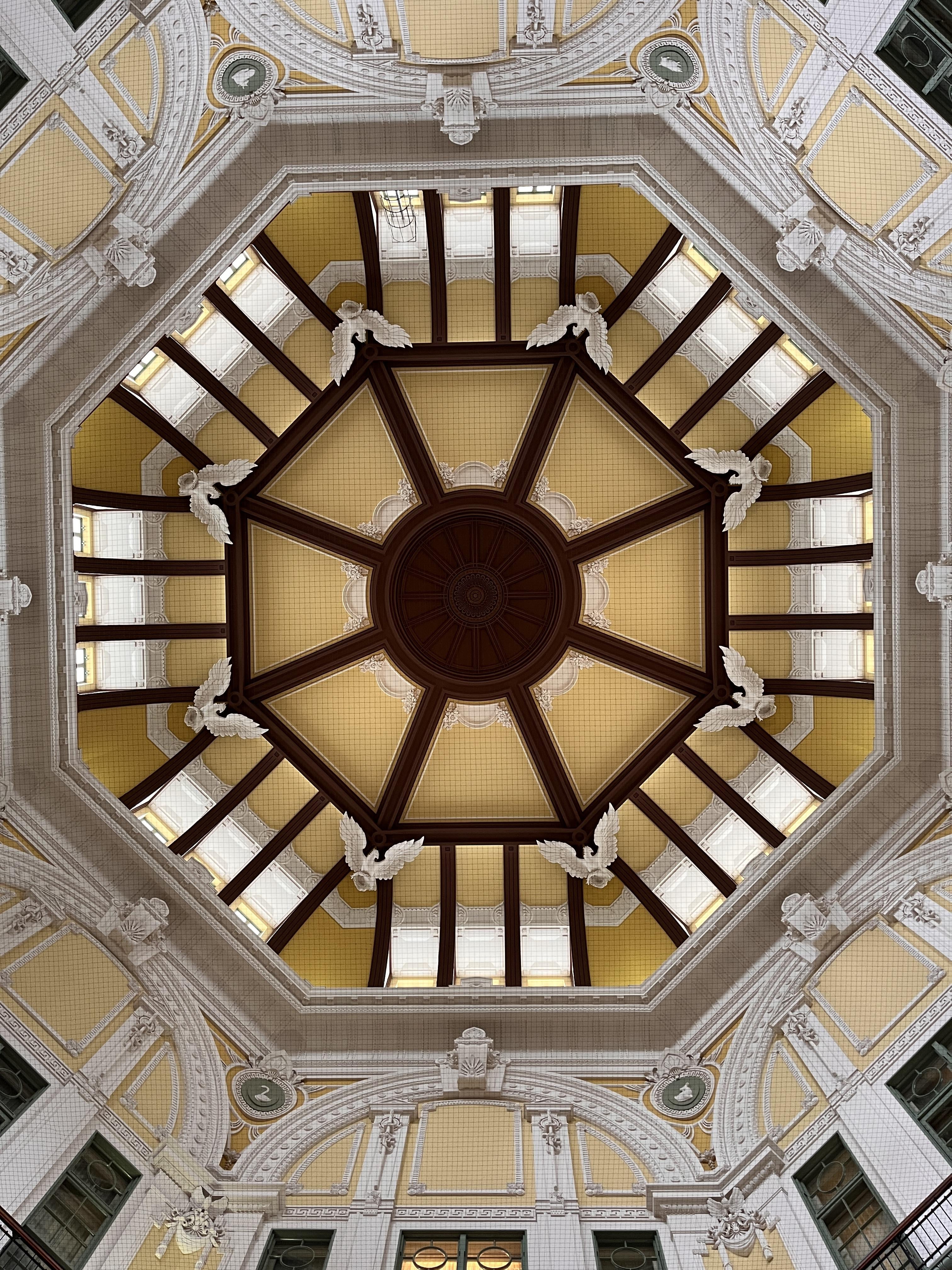 The fine visible grid is from a net they have stretched across the space. The architecture is a famous example of the work of Kingo Tatsuno. The eight relief carvings you see at the corners of the octagonal ceiling are of eagles (often mistaken for hawks or other birds). These are part of a larger zodiac theme throughout the dome; while eight of the zodiac animals are represented in these corners, the remaining four (the rat, horse, rabbit, and rooster) are famously located in a different city (Takeo Onsen) as part of a historical architectural puzzle/adventure.