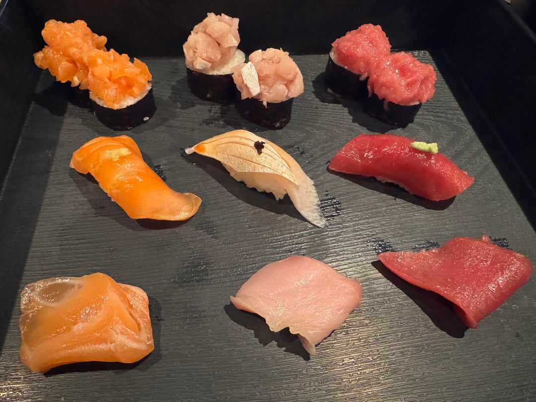 $26 lunch special. Three types of fish: salmon, hamachi, bluefin tuna and for each fish, two pieces of minced fish on a little rice and seaweed, one piece of nigiri, one piece of sashimi.