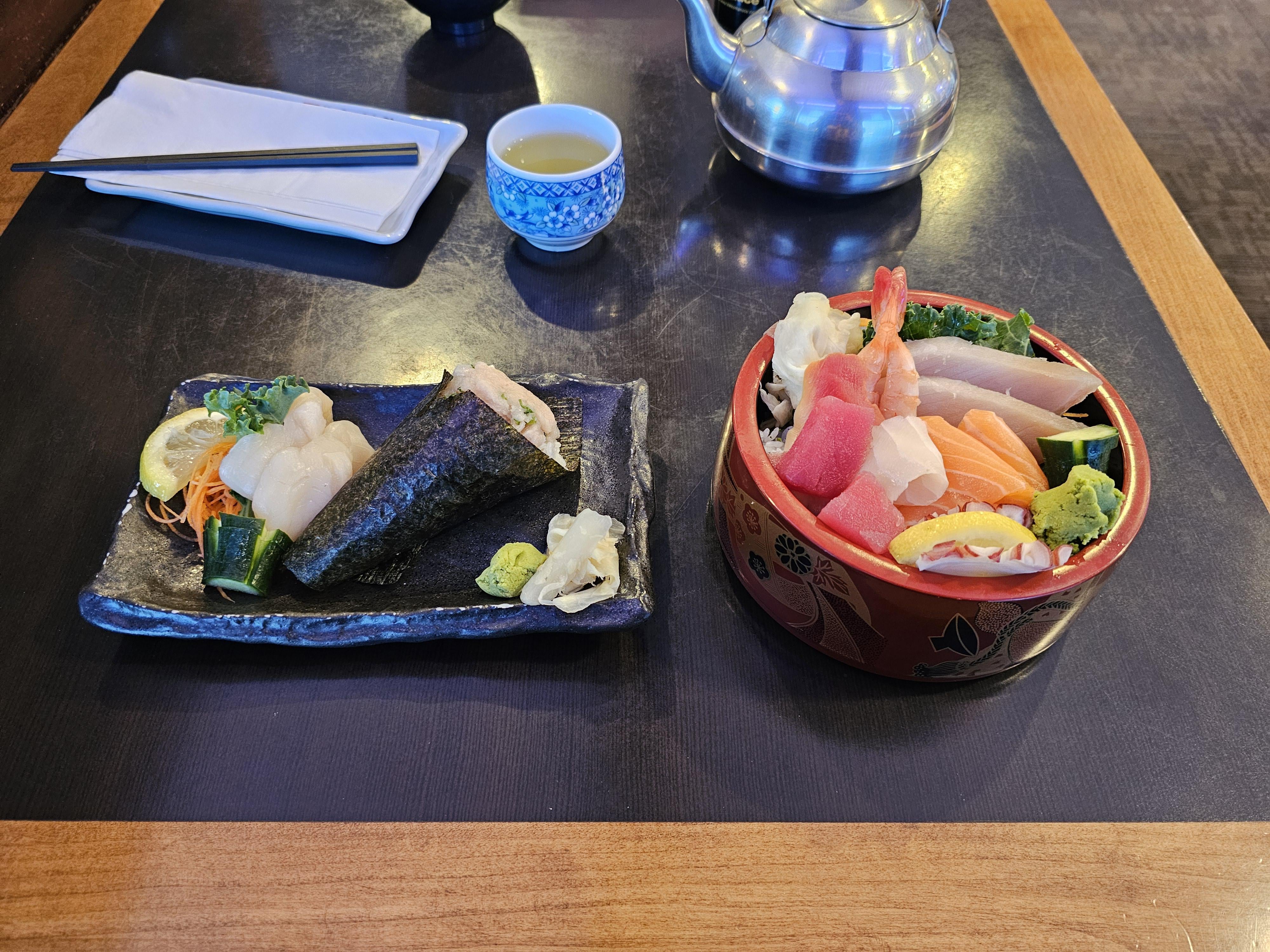 Chirashi, negi toro temaki, and scallop sashimi