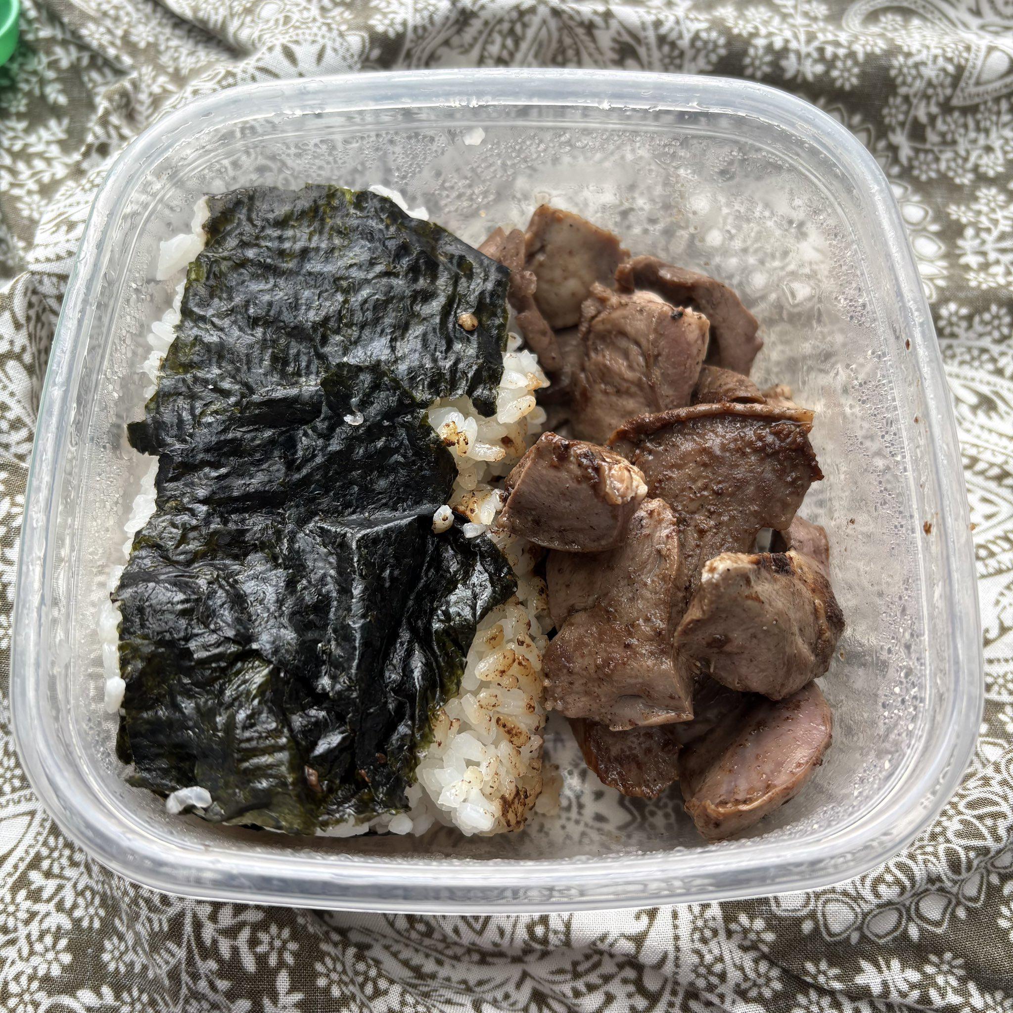 今日は「豚ハツの塩焼きのり弁当」。 本当はほうれん草とか、もう一品野菜を添えたかったな。