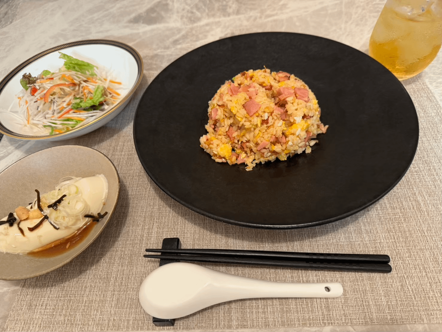 Japanese-style homemade fried rice set with loaded chilled tofu