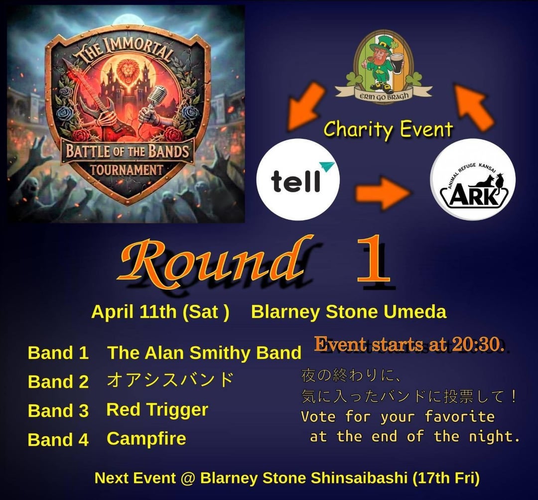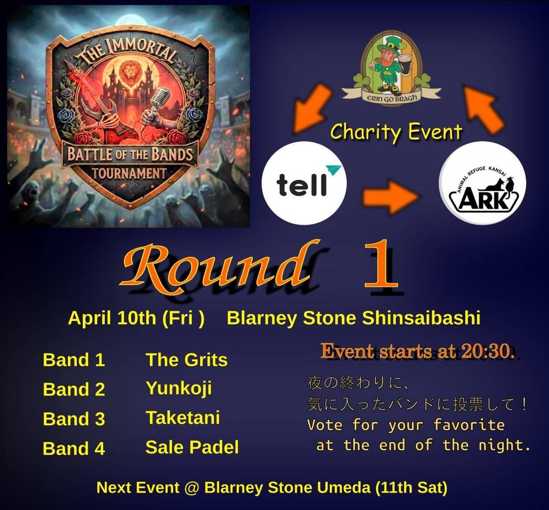 OOsaka The Immortal Battle of the Bands This Friday & Saturday in Shinsaibashi (4/10) & Umeda (4/11) @The Blarney Stone! April 8, 2026 Free event benefiting local NPOs– please come out and join! by too4coffee Tags:Osaka
