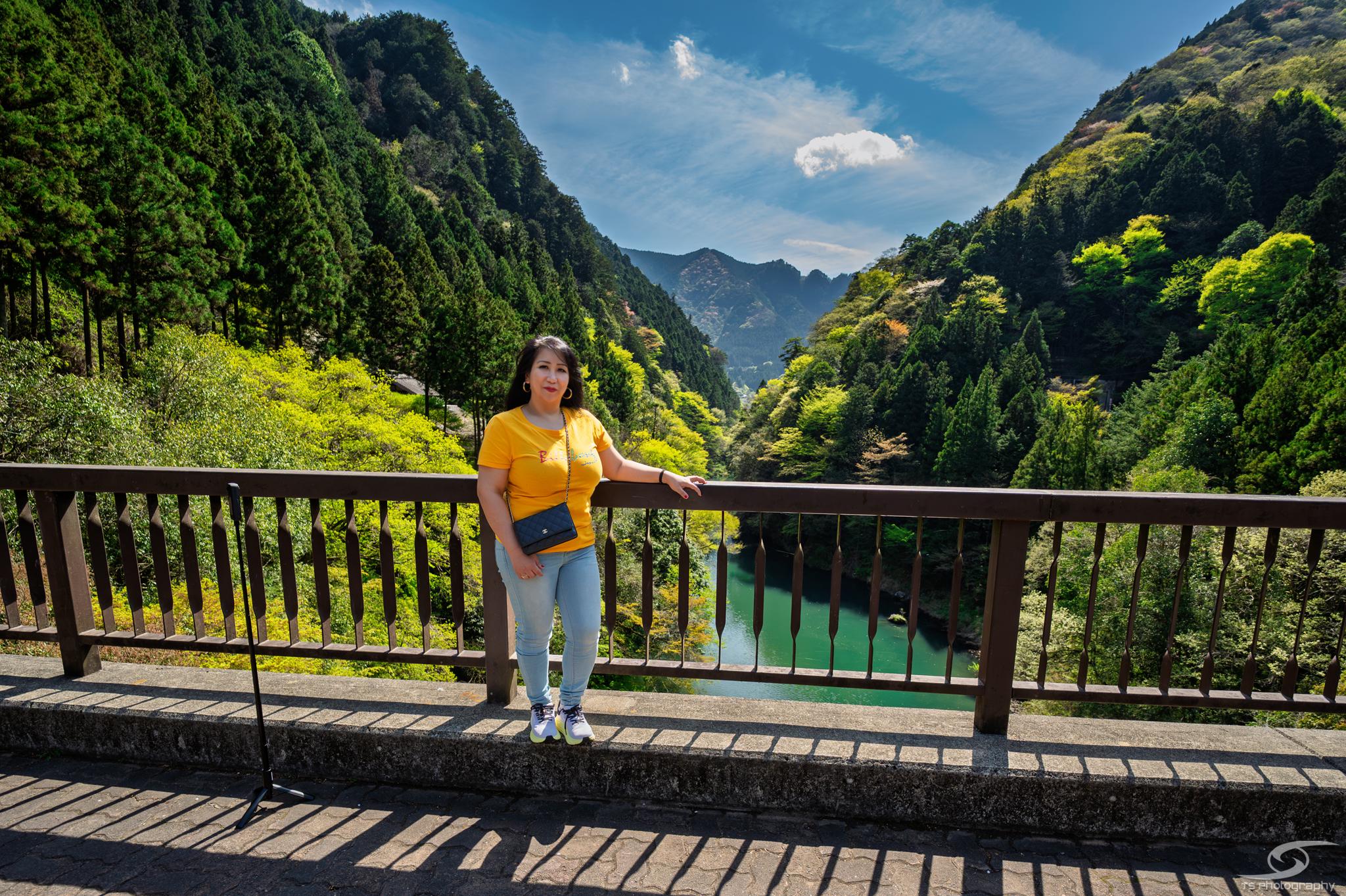 My wife standing over the Tama River near Okutama